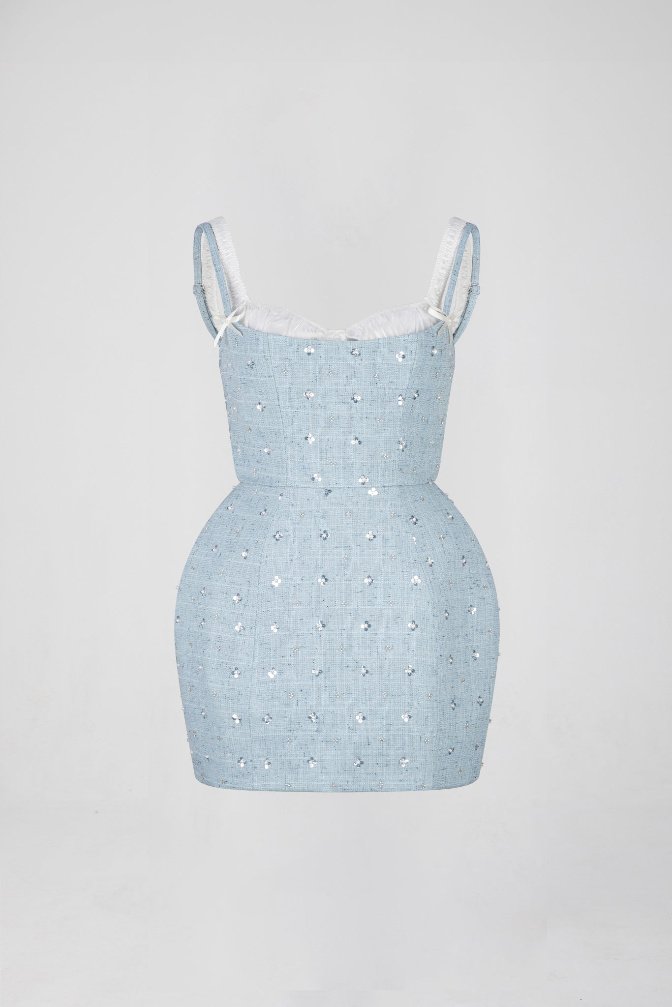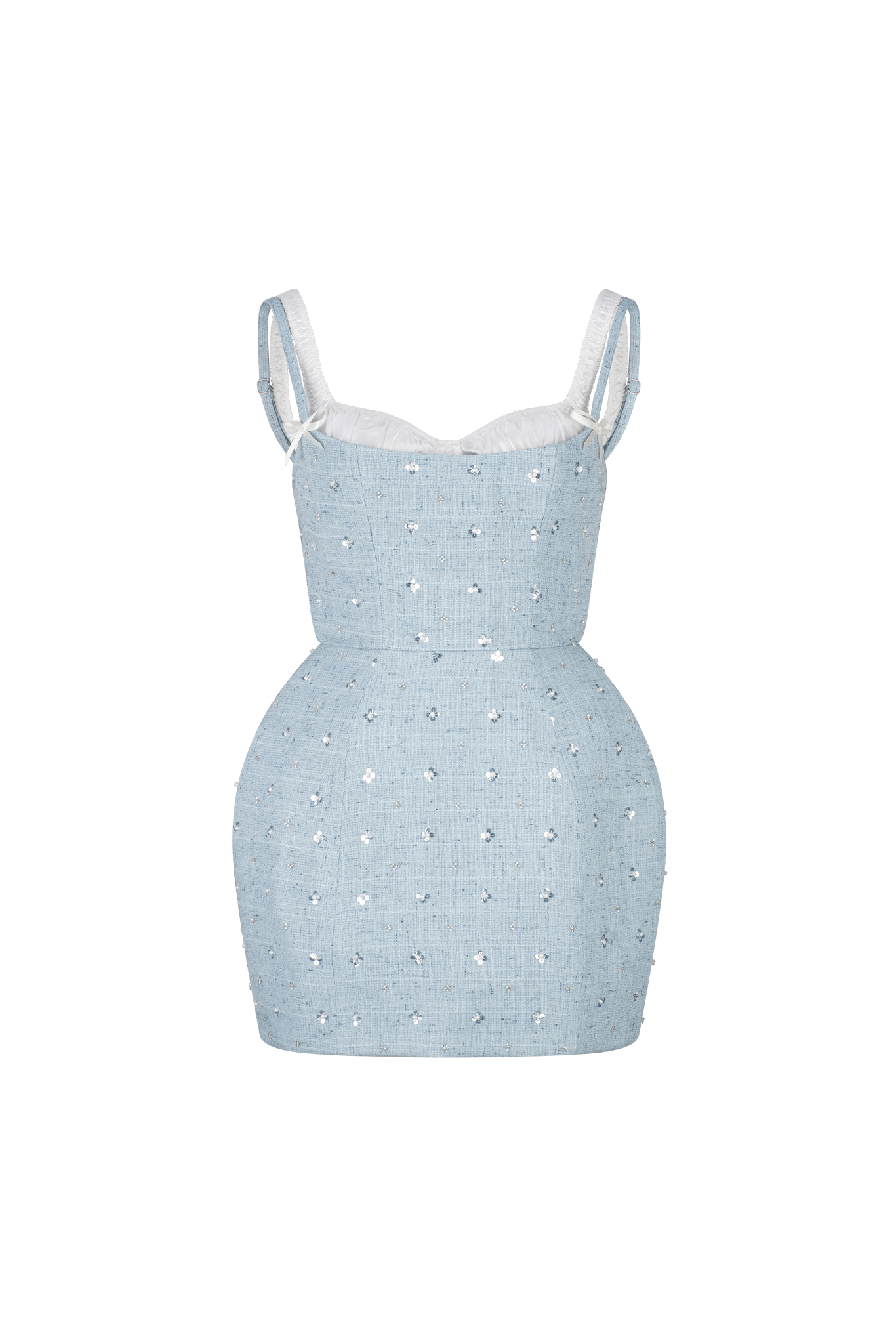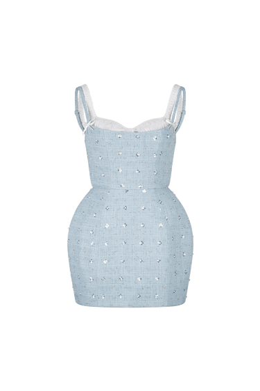 The Honey Mini has been restocked for the final time. The best-selling mini has been designed into a textured, embellished fabrication with corset detailing structuring the bodice. Contrast satin finish fabrication acts as a double layer at the bust for a detailed take on a classic mini.