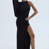 The Thessa Dress features an asymmetric one-shoulder design with a draped long sleeve and a fitted silhouette that contours the body. A high side slit adds movement and contrast, balancing strength with refined sensuality. Crafted from soft stretch jersey, the dress offers modern evening elegance with ease.