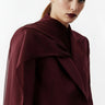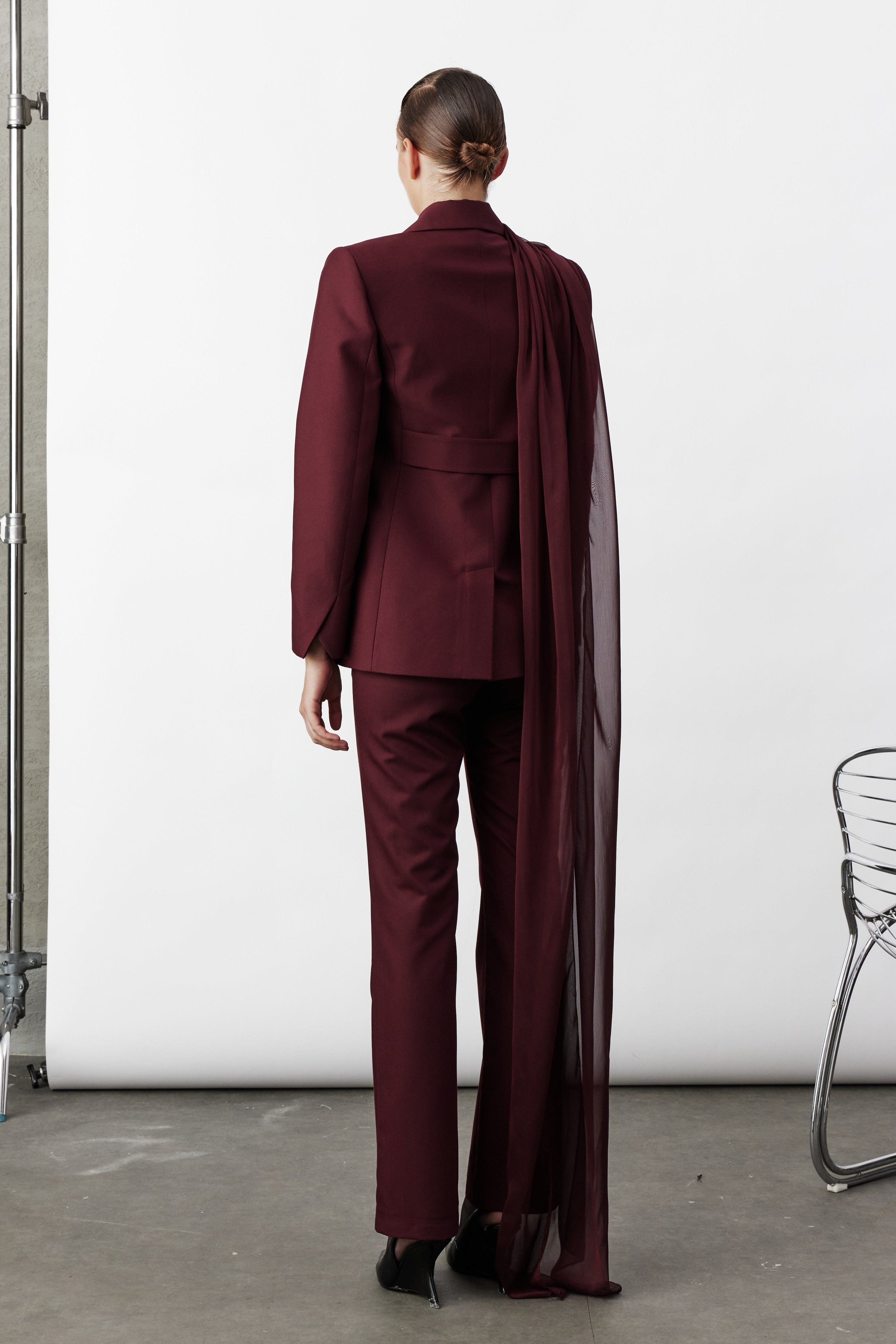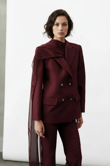 The Elodie Jacket features a double-breasted design with a chiffon fabric detail emerging from the inner lapel for a sophisticated touch. Fully lined for comfort, this jacket in a rich burgundy hue creates a strong silhouette. Styled in the collection with the Marde fabric skirt or Arced Trousers in bordeaux.