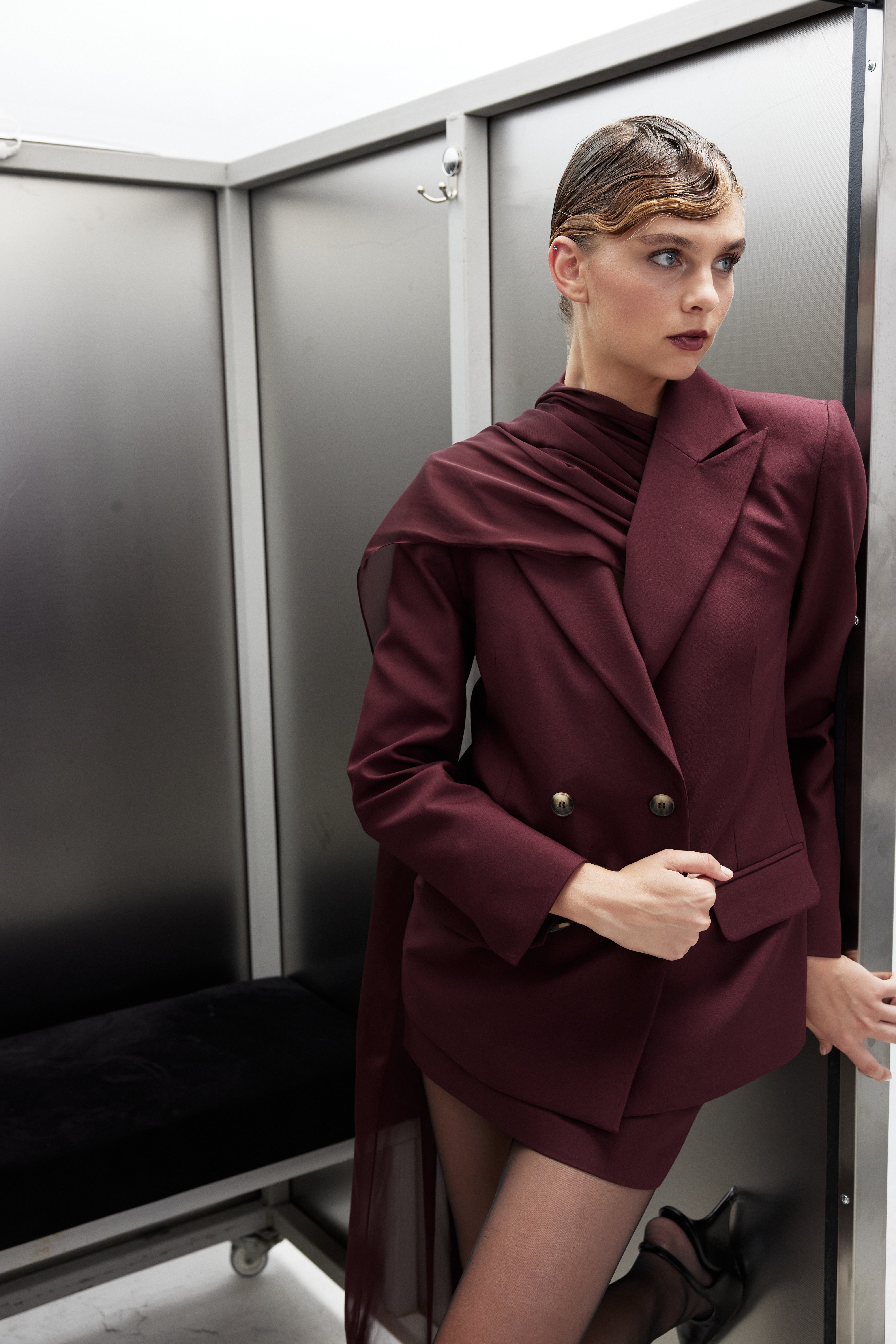The Marde Skirt features two decorative front pockets that add a modern detail. Fully lined with satin, it is styled with the Elodie Jacket as a set, and can also be paired elegantly with capes.