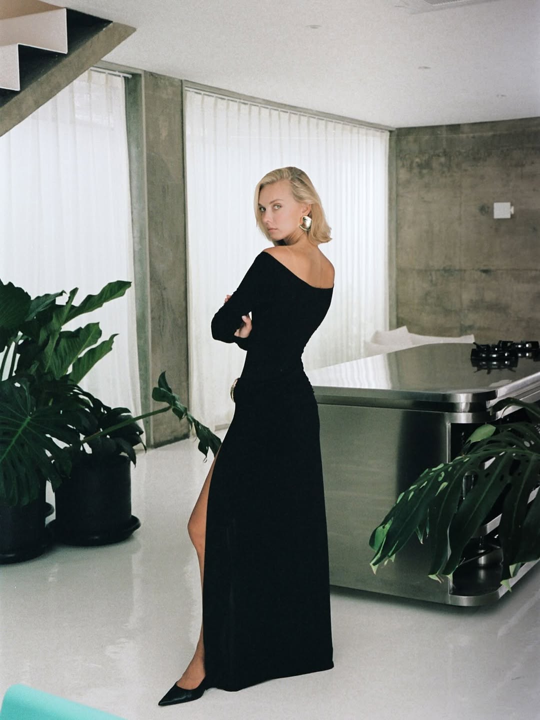 La robe Elisse présente un décolleté sculpté orné d'une découpe audacieuse sur le devant et une taille froncée soulignée par une boucle dorée. Ses manches longues ajustées et sa fente latérale haute créent un équilibre et allongent la silhouette, alliant sensualité et structure raffinée. Confectionnée en jersey stretch doux, la robe épouse les formes pour une silhouette fluide et maîtrisée.