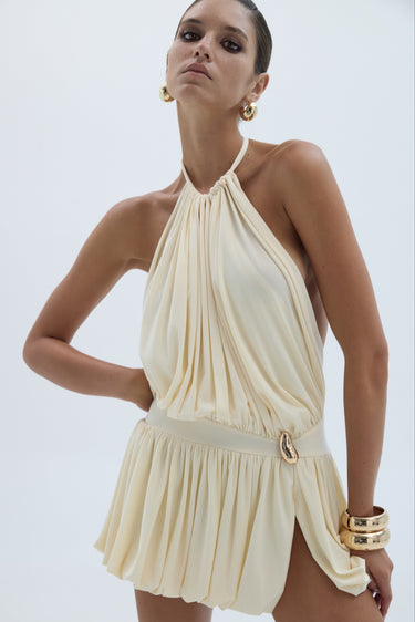 The halter neckline is secured with an adjustable neck tie, leading into an open back that emphasizes the shoulders and spine. The gathered draped top flows into a pleated mini skirt, creating soft volume and movement.