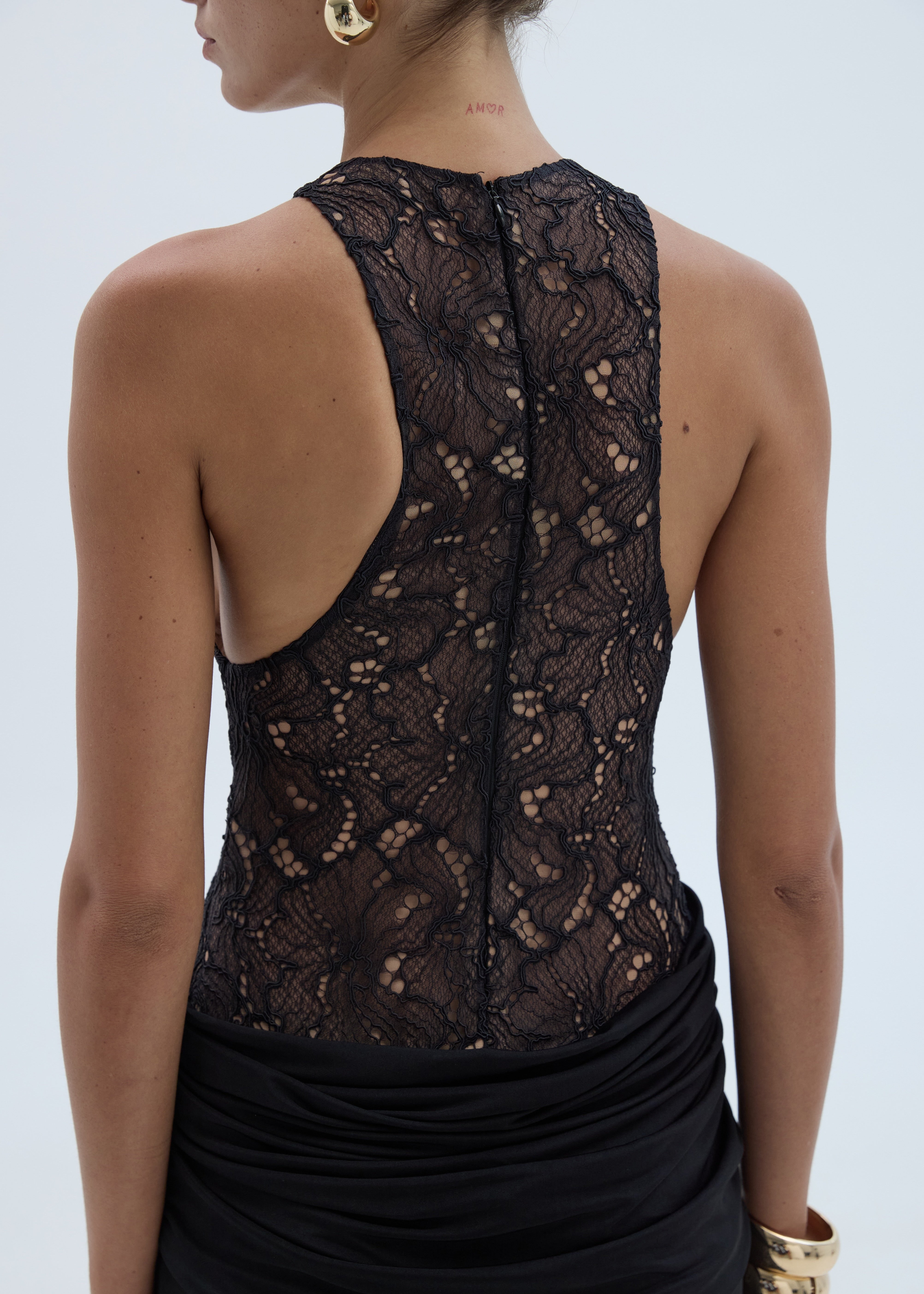 • Sleeveless lace halter bodice