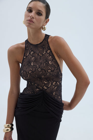 The Carmella Dress is a sleeveless lace halter maxi dress designed with an open neckline and a softly draped waist. The fitted lace bodice is fully lined for a smooth, non-transparent finish, while the floor-length skirt creates an elegant, fluid silhouette.