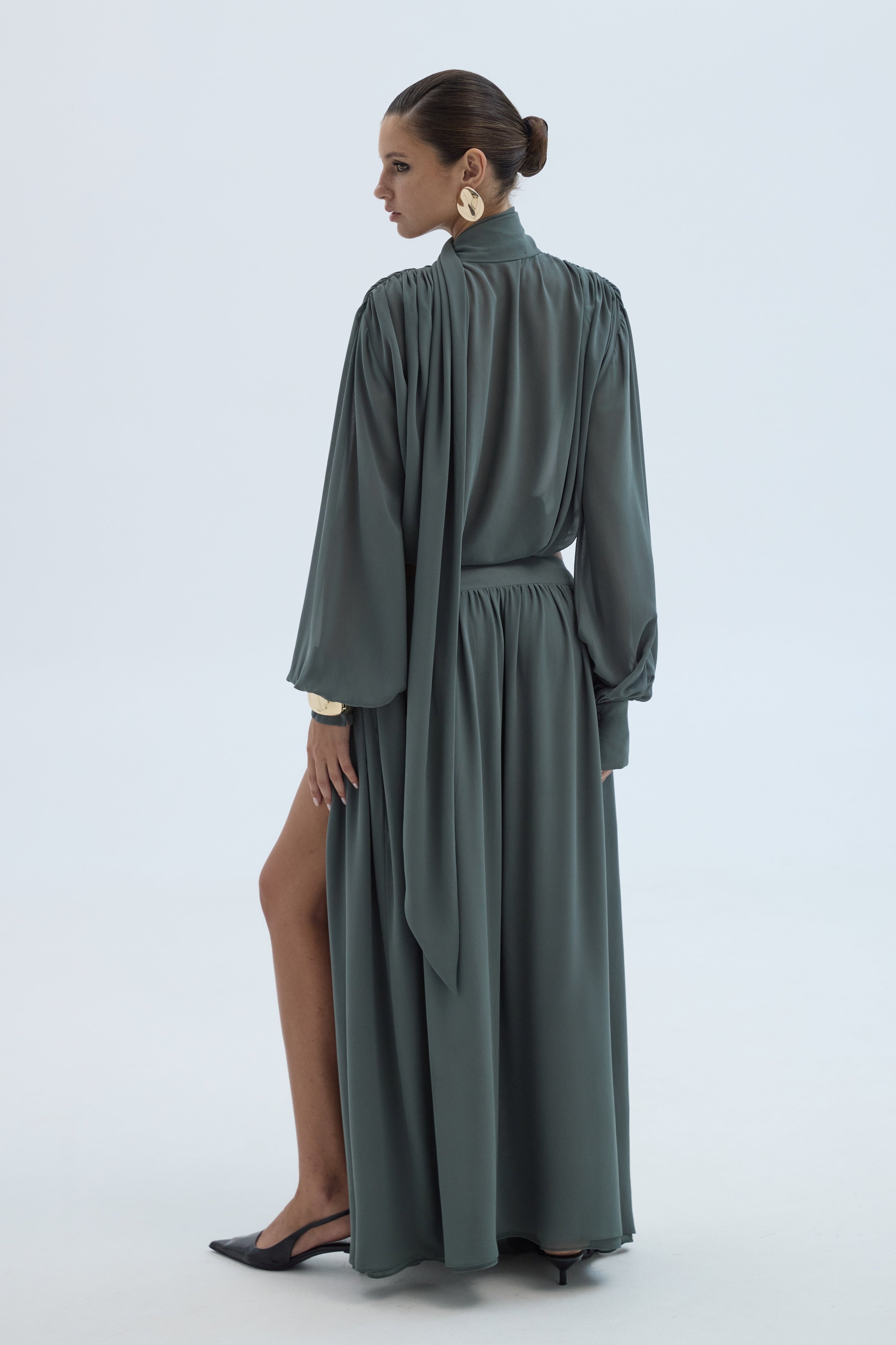The cropped top features a draped construction with long sheer sleeves, a deep front opening, and an attached neck tie that allows for adjustable styling. The lightweight fabric enhances the fluidity of the drape, creating natural movement with every step.