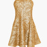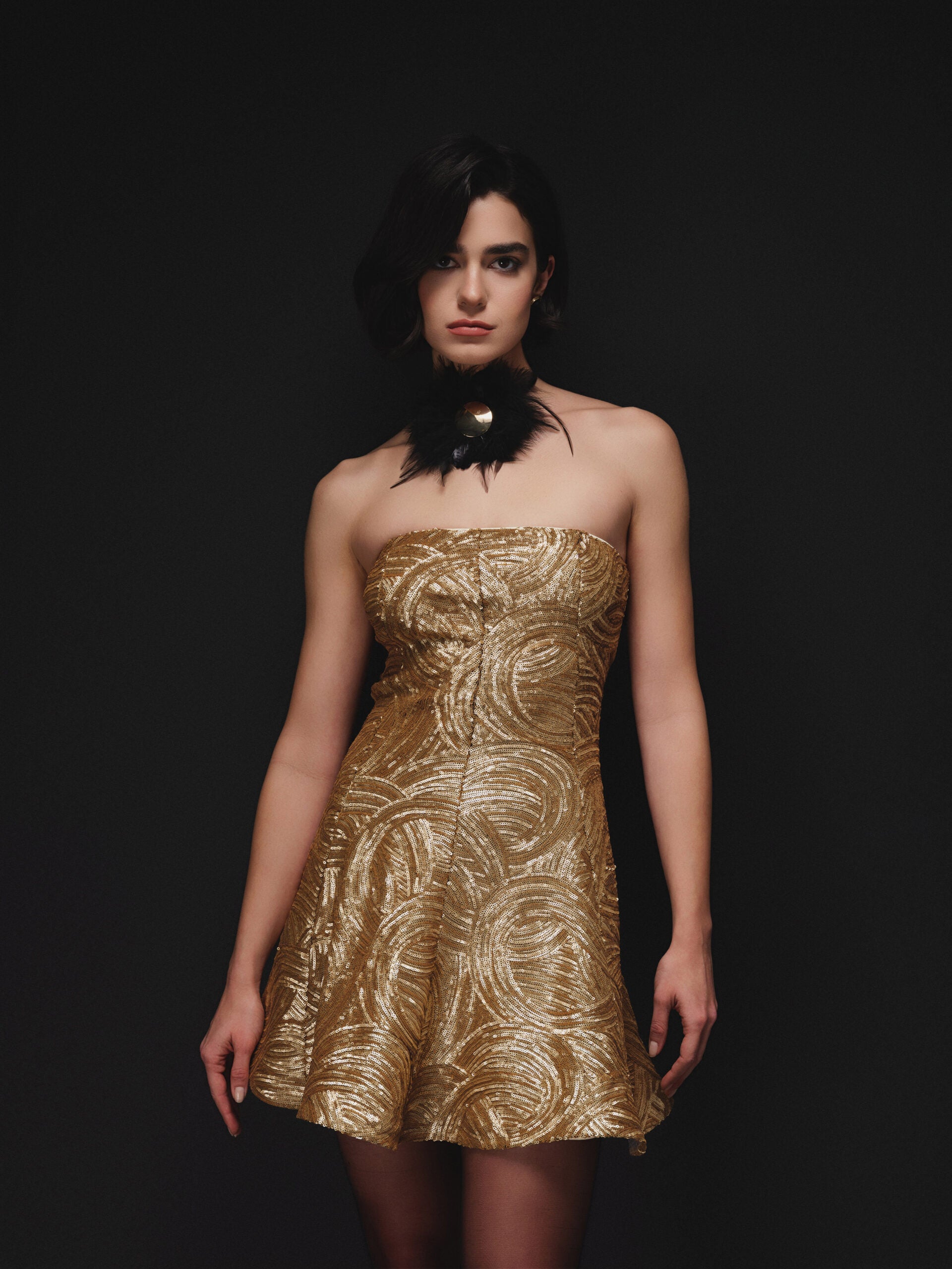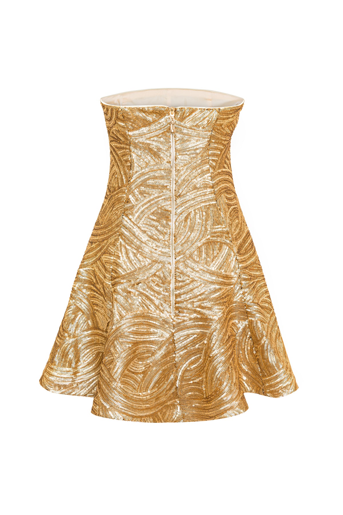 This dazzling strapless Park Avenue Poise mini dress features heavily embellished golden sequins, forming a mesmerizing swirl pattern that shimmers with every movement. The structured bodice hugs the figure, while the flared hem adds a playful yet sophisticated touch. This statement piece ensures high-impact glamour, making it perfect for evening events, parties, and special occasions where you will capture all the attention.