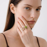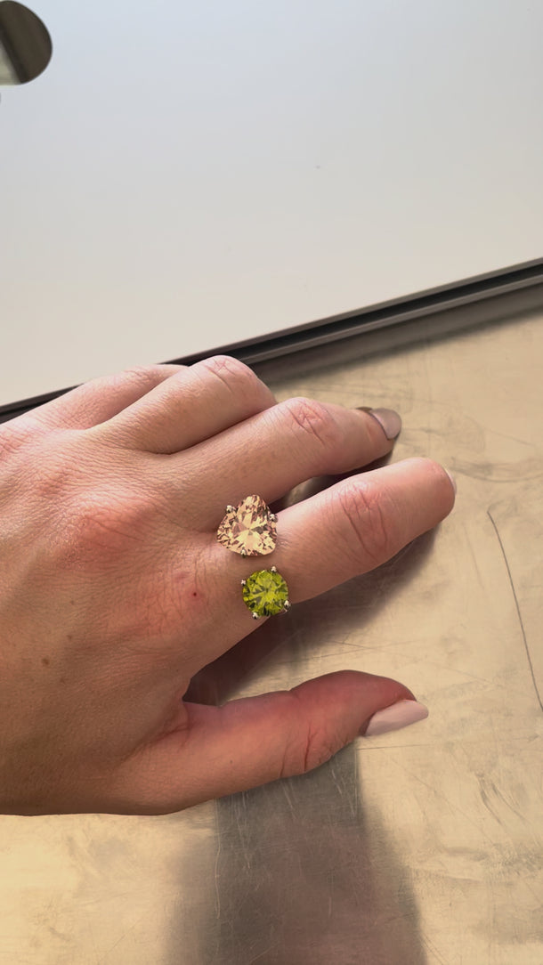 Two-Stone Open Ring is a modern statement ring designed to highlight contrast in color and geometry. The open silhouette features two opposing stones: a champagne-toned triangular-cut zirconia and a vivid lime-green round-cut zirconia, creating a playful yet sophisticated look.