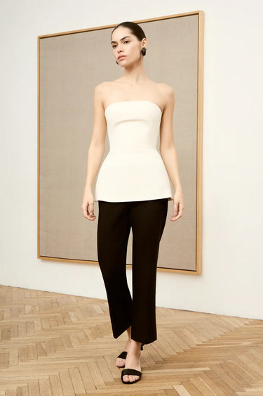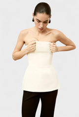 This strapless crepe top is a masterclass in modern minimalism. Designed with a sculpted bodice and soft peplum hem, it subtly defines the waist while maintaining a clean, fluid silhouette. The structured tailoring is balanced by its creamy off-white hue — a refined choice for evening moments or elevated daywear.